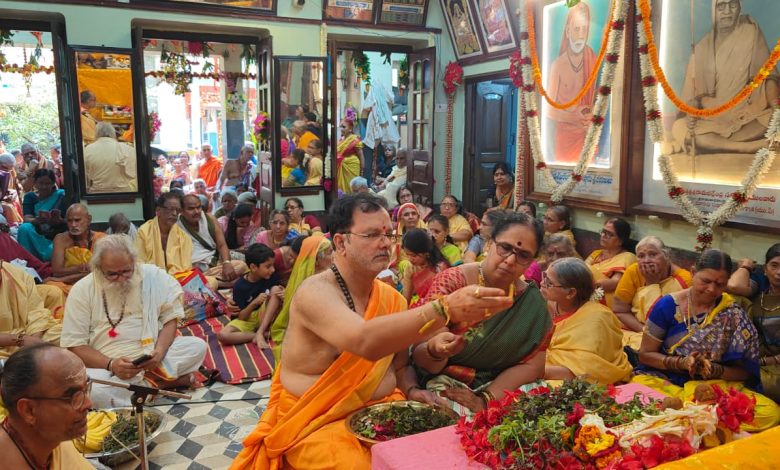 वाराणसी :- काशी के श्री राम तारक आंध्र आश्रम में शुक्रवार को श्री राम जानकी परिणयोत्सव की धूम रही | काशी केदार तीर्थ क्षेत्र में चल रहे द्वादश दिवसीय श्री राम पट्टाभिषेक महोत्सव के नौवें दिन रामालय मंडप में दाक्षिणात्य परंपरा के अनुसार श्री राम प्रभु व देवी जानकी का परिणयोत्स रचाया गया | इस अवसर पर वैदिक अनुष्ठानों के साथ दी हल्दी-कुंकुम जैसी लोकाचारी रीतियां भी निभाई गई | मंगलगीतों की स्वर लहरियों के बीच सुहागिन महिलाओं ने विवाह मंडप में हल्दी-कुंकुम का जो फाग रचाया उससे मंदिर प्रांगण में मानो लाल-पीली कालीन सी बिछ गई | इसके पूर्व उत्सव के यज्ञ मंडप में वैदिक शाखोच्चारों के बीच पुरोहितों ने विवाहकल्याणम की रीतियां पूरी कीं |