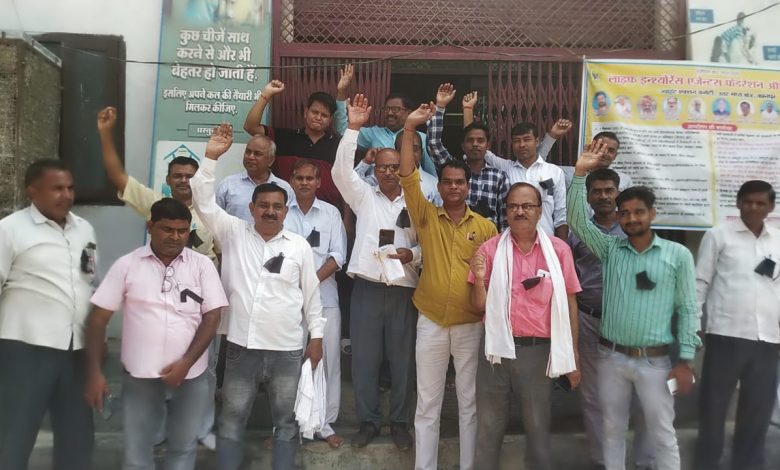 फ़ोटो परिचय-बेवर स्थित एलआईसी शाखा कार्यालय पर विरोध प्रदर्शन करते अभिकर्ता