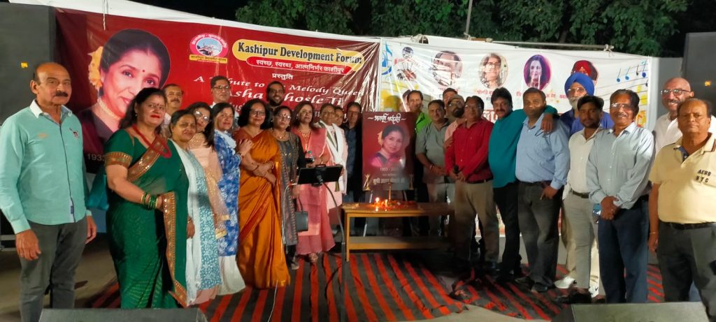 *काशीपुर / उत्तराखंड (नसरीन खान निशा ),,,:,,सुर कोकिला स्व. आशा भोसले जी की स्मृति में काशीपुर के द्रोणा सागर प्रांगण स्थित ओपन एयर थिएटर में सोमवार शाम एक भव्य संगीत समारोह का आयोजन किया गया। केडीएफ काशीपुर तथा म्यूजिक लवर्स क्लब काशीपुर के संयुक्त तत्वावधान में आयोजित इस श्रद्धांजलि सभा में शहर के लगभग 300 गणमान्य नागरिकों ने भाग लेकर स्वर साम्राज्ञी को याद किया।