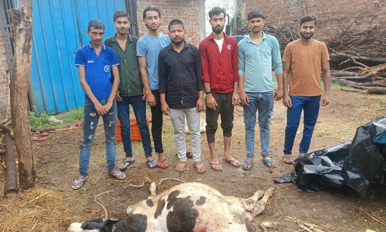 📸 तस्वीर में बछिया का शव और पास में खड़े ग्रामीण देखे जा सकते हैं।