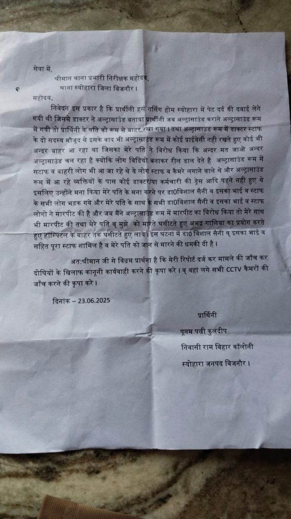 स्योहारा के चर्चित हंस क्लिनिक एक बार फिर विवादों में घिर गया है। सोमवार को एक महिला जब अपने पुलिसकर्मी पति के साथ अल्ट्रासाउंड कराने पहुंची, तो क्लिनिक स्टाफ ने उनके साथ कथित रूप से गाली-गलौच और दुर्व्यवहार किया गया