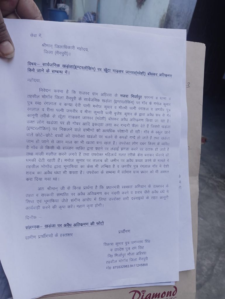 मैनपुरी – उत्तर प्रदेश के जनपद मैनपुरी के भोगांव के ग्राम मिजार्पुर थाना क्षेत्र में सावर्जनिक खड़ंजा इण्टरलाॅकिंग पर गाॅव के मनोज कुमार पुत्र स्व0 रंगलाल व कन्या देवी पत्नी मनोज कुमार व मौरश्री पत्नी रंगलाल व जगवीर पुत्र रंगलाल व रीना पत्नी जगवीर वह खुशबू पत्नी अनूप के द्वारा दबंगों ने अवैध रूप से खॅूटा नांद गाड़कर मवेशी बाॅधकर अवैध अतिक्रमण कर रखा है। दबंग लोग खडंजा पर ही गोबर आदि इकठ्ठा लगा कर गन्दगी फैला देते हैं जिससे खड़ंजा इण्टरलाॅकिंग पर निकलने वाले ग्रामीणों को बहुत ही परेशानी होती है गाॅव के स्कूल जाने वालें बच्चों को खडंजों पर चलने से कपड़े गन्दे हो जाते है जिससे खडंजा जाम हो जाने से बच्चों की जान का भी खतरा रहता है। उपरोक्त लोग दबंग किस्म के व्यक्ति है गाॅव के किसी भी व्यक्ति के कहने पर लड़ाई झगड़ा करने पर उतारू हो जाते है तथा गाली गलौज करने लगते हैं तथा उपरोक्त महिलायें गलत तरीके केस बनाकर फसाने की धमकी देती रहती हैं। मनोज कुमार पर तालाब की जमीन पर अवैध कब्जा करने के मामले में तहसील भोगाॅव द्वारा भूमाफिया का केस भी दर्ज है उपरोक्त के सम्बन्ध में वतर्मान ग्राम प्रधान को भी अवगत करा दिया गया था जिस पर प्रधान ने मुंह मोड लिया और समस्या का निवारण नहीं किया नहीं किया