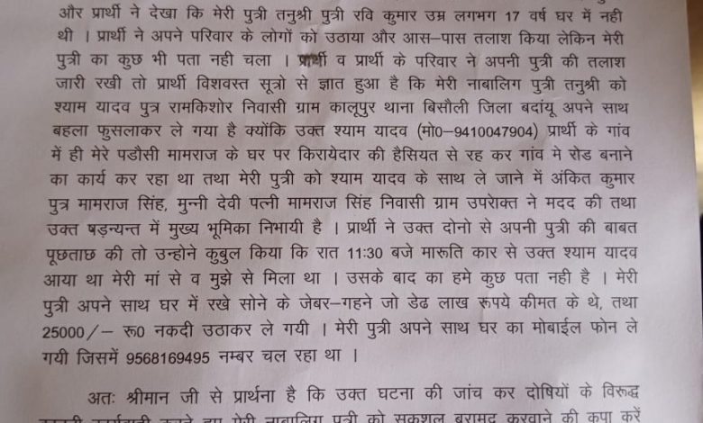 आपको बता दें कि जनपद बिजनौर के थाना नजीबाबाद के ग्राम रानीपुर निवासी रवि कुमार ने नजीबाबाद थाने में प्राथना पत्र दिया कि मेरी नाबालिग पुत्री तनुश्री जिसकी उम्र लगभग 17 वर्ष को श्याम यादव पुत्र रामकिशोर निवासी ग्राम कालूपुर थाना बिसौली जिला बदायूं अपने अपने साथ बहला-फुसलाकर ले गया श्याम यादव गांव में ही मामराज के घर पर किराए पर रहता था जो गांव में रोड बनाने का कार्य करता था वह मेरी पुत्री को बहला फुसलाकर अपने साथ ले गया सूत्रों से ज्ञात हुआ है कि उसकी मदद अंकित कुमार पुत्र मामराज सिंह मुन्नी देवी पत्नी मामराज सिंह निवासी उपरोक्त उसकी मदद करने में अहम भूमिका निभाई रवि कुमार ने बताया कि हम परिवार के सभी लोग रात 10:00 बजे रोज की तरह अपने घर में सो गए थे करीब 1:00 बजे मेरी आंख खुली और मैंने देखा कि मेरी पुत्री तनुश्री लगभग उम्र 17 वर्ष घर पर नहीं है मैंने अपने परिवार के सभी लोगों के साथ आसपास तलाश की उसका कोई सुराग नहीं मिला मैंने अपने पड़ोसी से पूछताछ की तो उन्होंने बताया कि रात 11: 30 बजे मेरे पास मारुति कार से श्याम यादव आया था मेरी मां से वह मुझसे मिला था उसके बाद का हमें उसका भी कुछ पता नहीं रवि कुमार ने थाना नजीबाबाद में प्रार्थना पत्र देकर अपनी नाबालिग पुत्री को तलाश करने की गुहार लगाई