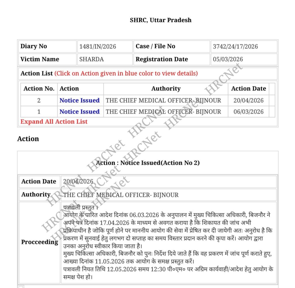 मानवाधिकार आयोग सख्त, फिर भी जांच अधूरी — CMO बिजनौर ने मांगा अतिरिक्त समय