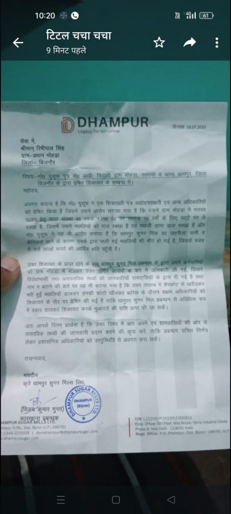 शुगर मिल धामपुर के केमिकल युक्त पानी से हुए लाखो के नुकसान से पीड़ित ने उत्तरप्रदेश प्रदूषण नियंत्रण बोर्ड बिजनोर को प्रार्थना पत्र सौप की पानी की जांच की माँग!