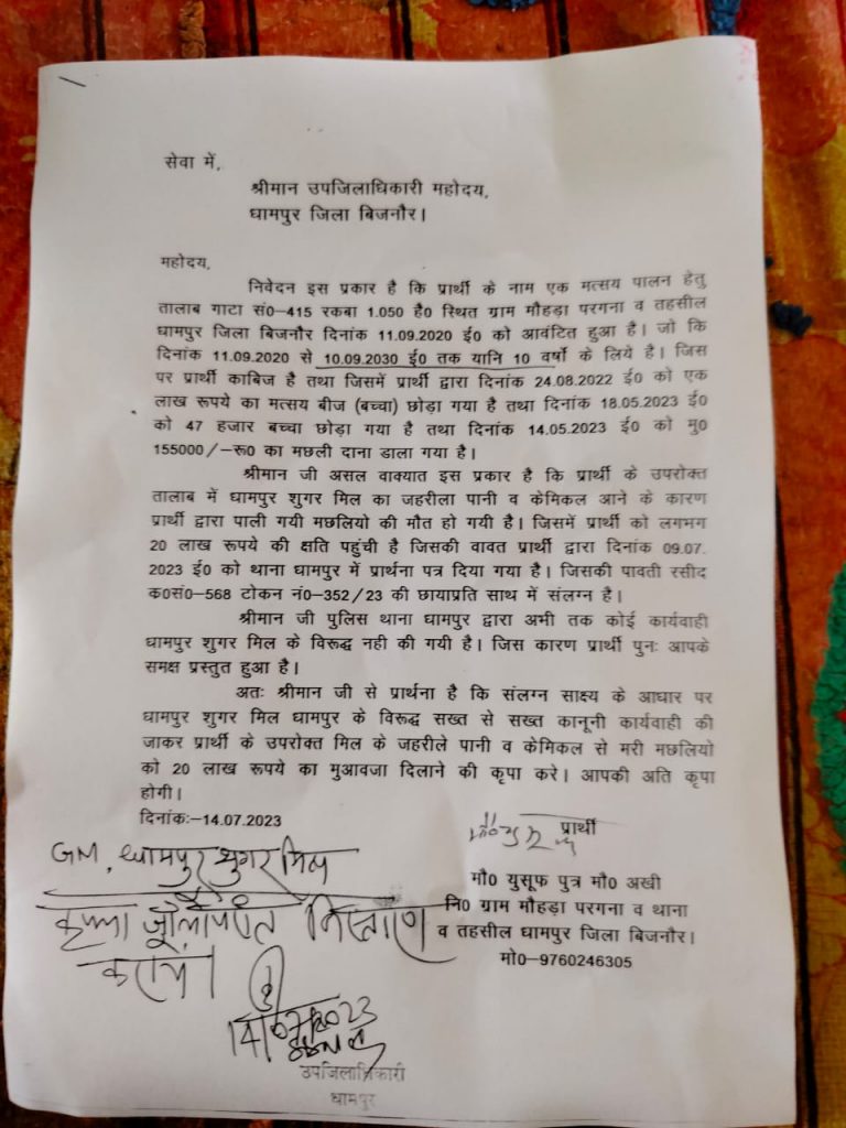 उपजिलाधिकारी को भी एक प्रार्थना पत्र देकर जांच कर मुआवजे की मांग की थी धामपुर उपजिलाधिकारी ने कारखाना प्रबंधक को फोन कर जो तालाब में केमिकल युक्त जहरीला पानी जाने के कारण मछलियों की मृत्यु हो गई थी जांच कर जल्द से जल्द निस्तारण करने के आदेश दिए थे