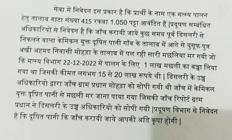 मोहड़ा निवासी पट्टा धारक मोहम्मद यूसुफ ने बताया कि वह पिछले कई वर्षों से तालाब में मछली पालन कर अपने बच्चों का पालन पोषण कर रहा हूँ वही धामपुर शुगर मिल का केमिकल युक्त जहरीला पानी तालाब में आने से तालाब की सारी मछलियां मर चुकी हैं