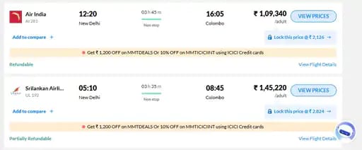 मेकमायट्रिप की वेबसाइट पर आज 14 और 15 फरवरी को दिल्ली-मुंबई से कोलंबो फ्लाइट का किराया एक पैसेंजर के लिए ₹1.45 लाख तक दिखा रहा है। आम दिनों में कोलंबो की डायरेक्ट फ्लाइट का किराया 30 हजार रुपए के आस-पास तक रहता है। वहीं कोलंबो में बड़े होटलों का किराया भी ₹1.14 लाख तक पहुंच गया है।