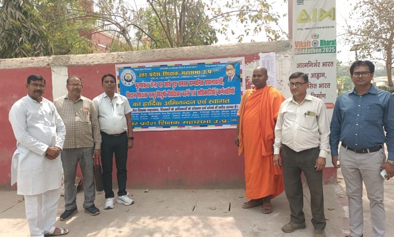 वाराणसी :- उत्तर प्रदेश शिक्षक महासभा का प्रतिनिधि मंडल जनपद ईकाई वाराणसी के पीएमश्री प्रभु नारायण राजकीय इंटर कॉलेज रामनगर,पीएमश्री क्वीन्स इंटर कॉलेज लहुराबीर, भारतीय शिक्षा मंदिर इंग्लिशिया लाईन कैंट वाराणसी एवं जेपी मेहता नगर निगम कचहरी वाराणसी के सभी मूल्यांकन केंद्रों के मुख्य द्वार पर फ्लैक्स लगाकर समस्त सम्मानित प्रधानाचार्यगण, विद्वान शिक्षक बंधुओं/शिक्षिका एवं अधिकारियों/कर्मचारियों का स्वागत एवं अभिनन्दन किया तथा उत्तर प्रदेश शिक्षक महासभा के संकल्प पत्र को चस्पा किया गया | इस अवसर पर भंते डॉ.धम्मप्रिय,संरक्षक कुॅंवर जीत इलाहाबादी,प्रांतीय महामंत्री नीरज कुमार विमल,प्रांतीय संगठन मंत्री सुबास सरोज,प्रांतीय कार्यकारिणी सदस्य सत्य प्रकाश पटेल,मंडल उपाध्यक्ष शैलेन्द्र कुमार गौतम,मंडल महामंत्री शंकर दीप राम,जिला संरक्षक सुजीत कुमार, जिलाध्यक्ष पुष्प चंद्र सागर,जिला संगठन मंत्री अनूप भास्कर,जिला संगठन मंत्री अजय कुमार कुशवाहा,प्रधानाचार्य मनोज कुमार,प्रवक्ता अजेंद्र कुमार,जयशंकर एवं अन्य शिक्षकगण शामिल रहे ||