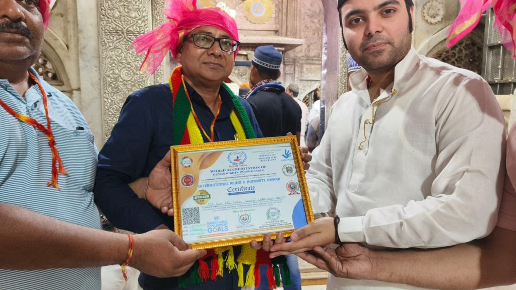 अजमेर – ख्वाजा गरीब नवाज की दरगाह परिसर में आयोजित एक गरिमामय समारोह में संस्कार न्यूज के प्रधान संपादक श्री विजय कुमार शर्मा और दरगाह के गद्दीनशीन सैयद अली अब्बास गुर्देजी को WAOHR-India (World Accreditation of Human Rights) द्वारा अंतरराष्ट्रीय स्तर के “इंटरनेशनल पीस एंड ह्यूमैनिटी अवॉर्ड” से सम्मानित किया गया।