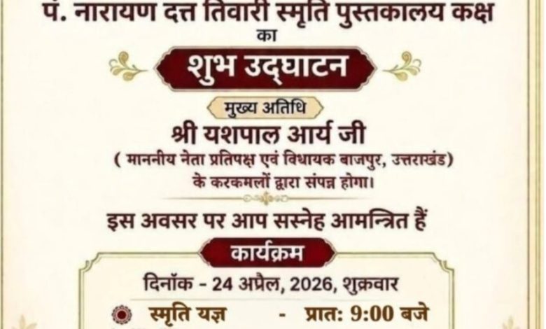 काशीपुर / उत्तराखंड (रिज़वान अहसन ),,,,,परमश्रद्धेय स्वर्गीय सत्येन्द्र चन्द्र गुड़िया जी के सोलहवें स्मरण दिवस के अवसर पर “सत्येन्द्र चन्द्र गुड़िया मैनेजमेंट एंड लॉ कॉलेज” में विधायक निधि से निर्मित पं. नारायण दत्त तिवारी स्मृति पुस्तकालय कक्ष का शुभ उद्घाटन 24 अप्रैल 2026, शुक्रवार को किया जाएगा।
