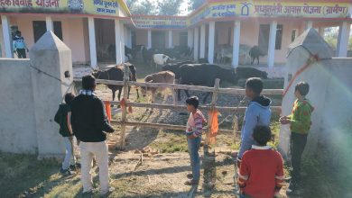 फसलों को बर्बाद कर रहे निराश्रित पशुओं को पकड़कर किसानों ने नवनिर्मित पंचायत भवन बांध दिया