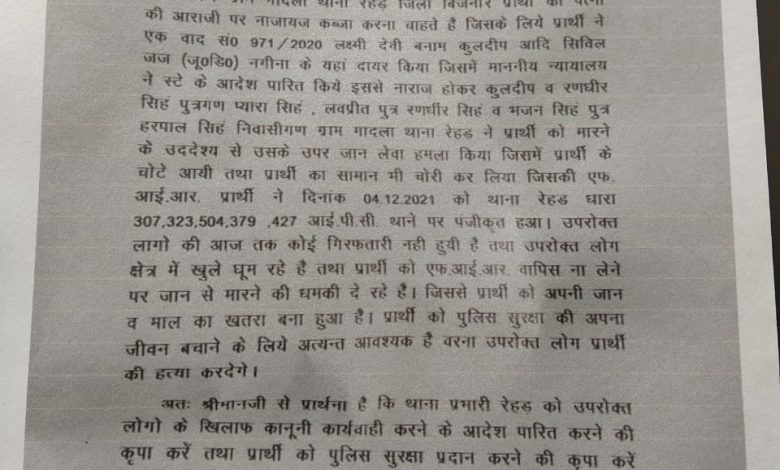 प्रार्थी का कहना है कि रणधीर सिंह कुलदीप सिंह पुत्र प्यारा सिंह निवासी गण ग्राम गदाला थाना रेहड जनपद बिजनौर प्रार्थी डॉ आर के गोला की पत्नी की आराजी पर नाजायज कब्जा करना चाहते हैं जिसके लिए प्रार्थी ने एक वाद संख्या 971/ 2020 लक्ष्मी देवी बनाम कुलदीप आदि सिविल जज नगीना के यहां दायर किया जिसमें माननीय न्यायालय ने स्टे के आदेश पारित किए इससे नाराज होकर कुलदीप व रणधीर उत्तरण प्यारा सिंह लवप्रीत पुत्र रणधीर सिंह वह भजन सिंह पुत्र हरपाल निवासी गढ़ ग्राम गजाला थाना रेहान ने प्रार्थी को मारने के उद्देश्य से उसके ऊपर जानलेवा हमला किया !